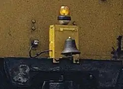 Allocated to work the Weymouth Harbour Tramway, trains operating over public thoroughfare tramway without escort are required to be fitted with warning equipment for the general public. Before its withdrawal, the Class 33 Weymouth pilot would regularly take fuel-oil tank wagons (for the ferries) and occasionally boat-train stock between Weymouth yard and ferry terminal. It had a bell and beacon fitted at both ends above the lower-centre headcode lamp (along with SR style high-level brake pipes) which served to warn thoroughfare users and was controlled from the cab. For main-line stock, two warning units were built and housed in a cabinet at the track side of the quay spur at the throat of the yard. This equipment comprised a yellow control box with amber rotating beacon and bell which fitted on a bracket just above the rubbing plate on the cab front. Class 33/1 and all TC stock were equipped with this bracket and had a socket where units plugged-in to draw power from the train systems, similar to the RCH socket on coaching stock. This was a specific complexity with the two types and in order to standardize and remove a maintenance risk, in the early 1980s, three battery-powered units were constructed which mounted on a standard lamp bracket with no need to draw power from the train. This allowed the power and control circuitry for warning units to be removed during (and thus simplifying) overhaul. The old power sockets were gradually removed and plated-over but some remained until withdrawal of the stock. These new warning units enabled other types of stock to use the tramway including Class 73 and Class 37 (on a railtour - which struggled with the tight curves of the tramway due to its three-axle bogies). These later warning units were smaller with an on/off switch on the rear of the unit and no bell – warnings being given using the train horn.