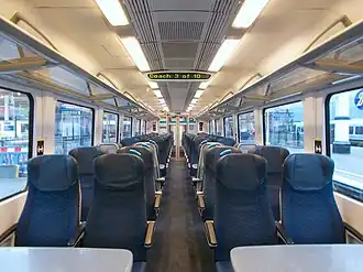 Each five-car unit has a first-class section taking up just over half of one car at one end. All seats have BS 1363 230 V mains sockets providing AC power for laptops or mobile phone chargers.