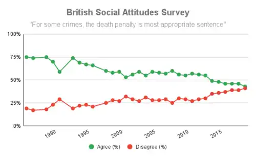 Support for the death penalty has gradually decreased from 75% in 1986 to 43% in 2019. From 2014 onwards, less than half of people supported the use of capital punishment.[4]
