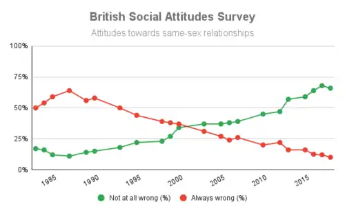 17% of people believed same-sex relationships were 'not wrong at all' in 1983 and the proportion of people holding this view reached a low of 11% in 1987 during the height of the AIDS pandemic. An increasing number of people were comfortable with same-sex relationships during the period 1989-2017 and as of 2018 66% of people do not consider same-sex relationships to be 'wrong at all'.[5]