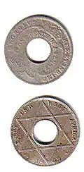 In 1907, aluminium 1⁄10d and cupro-nickel 1d coins were introduced. Both coins were holed. In 1908, cupro-nickel replaced aluminium in the 1⁄10d and, in 1911, holed, cupro-nickel 1⁄2d coins were introduced. In 1913, silver 3d and 6d, 1/– and 2/– were introduced. In 1920, brass replaced silver in these denominations.