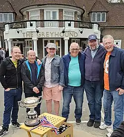 The British and World Marbles Championship is a marbles knock-out tournament that takes place annually on Good Friday and dates back to 1588. It is held at the Greyhound public house in Tinsley Green, West Sussex.[1] Teams of six players participate to win the title and a silver trophy. The event is open to anyone of any age or nationality. Over the years, players from Australia, Belgium, Canada, Estonia, Ireland, France, Germany, Japan, Netherlands, Wales and the United States have participated alongside English teams.[2][3][4]