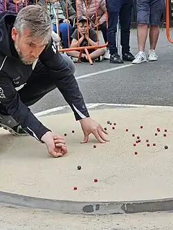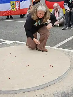 The championships are organized by the British Marbles Board of Control (BMBC)[15] and the version of marbles played is Ring Taw, known in the United States as "Ringer" [16] and in Germany as "Englisches Ringspiel". Forty-nine target marbles are grouped closely together in 6-foot diameter (1.8-metre)[17] raised concrete ring covered with sand, each of the target marbles being a coloured glass or ceramic sphere having a diameter of approximately 12mm (half an inch).[16]