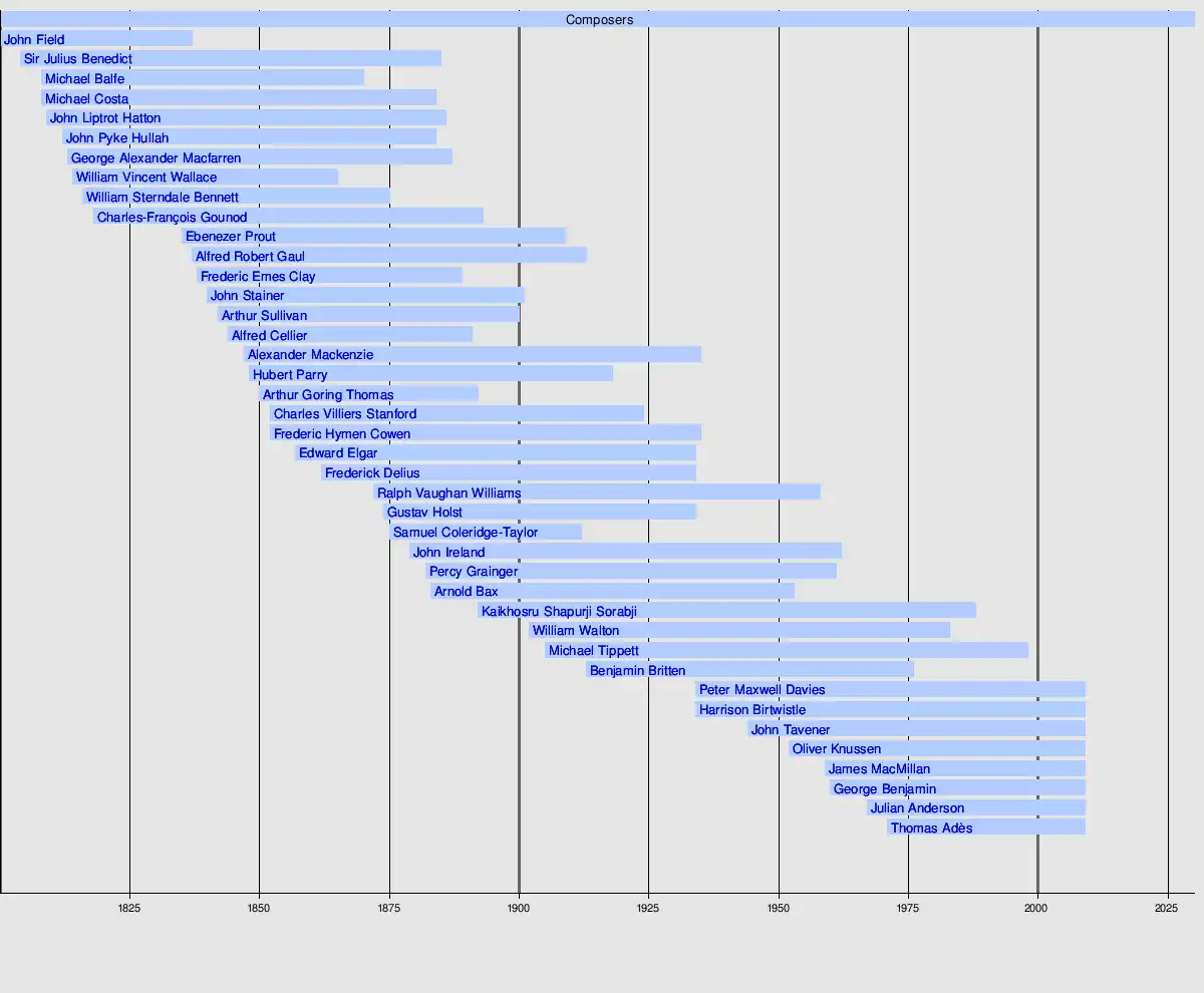 Thomas AdèsJulian AndersonGeorge Benjamin (composer)James MacMillan (musician)Oliver KnussenJohn TavenerHarrison BirtwistlePeter Maxwell DaviesBenjamin BrittenMichael TippettWilliam WaltonKaikhosru Shapurji SorabjiArnold BaxPercy GraingerJohn IrelandSamuel Coleridge-TaylorGustav HolstRalph Vaughan WilliamsFrederick DeliusEdward ElgarFrederic Hymen CowenCharles Villiers StanfordArthur Goring ThomasHubert ParryAlexander MackenzieAlfred CellierArthur SullivanJohn StainerFrederic Emes ClayAlfred Robert GaulEbenezer ProutCharles-François GounodWilliam Sterndale BennettWilliam Vincent WallaceGeorge Alexander MacfarrenJohn Pyke HullahMichael CostaMichael BalfeSir Julius BenedictJohn Field