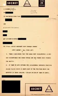 During the Cuban Missile Crisis, GCHQ Scarborough intercepted radio communications from Soviet ships reporting their positions and used that to establish where they were heading. A copy of the report was sent directly to the White House Situation Room, providing initial indications of Soviet intentions with regard to the US naval blockade of Cuba.[4]