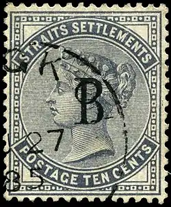 After the closure of the post office in July 1885, the B overprinted stamps were seen used elsewhere. An example is a cover sent from Singapore in December 1887 bearing postage stamps from Straits Settlements both with and without the overprint.[1]