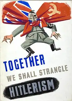 Propaganda fomented support for allies in the war, first for the European nations and then for the USSR and USA, with support for the Commonwealth being pervasive.[53] Promoting disunity was, in fact, a major desire of Axis forces.[54] Depictions of forces included Malays,[55] West Africans,[56] and Soviet.[57] Many posters depicted soldiers from different countries, such as Australian and British,[47] many Commonwealth countries,[58] various occupied countries,[59] and many Allied countries,[60] or British and American sailors.[61] Merchant ships were used to dramatise Lend-Lease.[62] Resistance movements were also depicted,[63] sometimes with Allied agents[64] or receiving message from them.[65]
