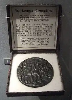 British propagandists were able to use the sinking of the Lusitania as atrocity propaganda because of a commemorative medal privately struck by German artist Karl Goetz a year later. The British Foreign Office obtained a copy of the medal and sent photographs of it to America. Later, to build on anti-German sentiment, a boxed replica was produced by Wellington House that was accompanied by a leaflet explaining the barbarism of Germany. Hundreds of thousands of replicas were produced in total,[34] but Goetz's original had been made in an edition of fewer than 500. Another false story wide reported in the Northcliffe papers said that Germany used "corpse factories" to boil down the corpses of soldiers into lubricating oils and pig food.[35]