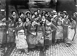 Women's historians have debated the impact of the Industrial Revolution and capitalism generally on the status of women.[36][37][38] Taking a pessimistic view, Alice Clark argued that when capitalism arrived in 17th century England, it made a negative impact on the status of women as they lost much of their economic importance. Clark argues that in 16th century England, women were engaged in many aspects of industry and agriculture. The home was a central unit of production and women played a vital role in running farms, and in operating some trades and landed estates. For example, they brewed beer, handled the milk and butter, raised chickens and pigs, grew vegetables and fruit, spun flax and wool into thread, sewed and patched clothing, and nursed the sick. Their useful economic roles gave them a sort of equality with their husbands. However, Clark argues, as capitalism expanded in the 17th century, there was more and more division of labour with the husband taking paid labour jobs outside the home, and the wife reduced to unpaid household work. Middle-class women were confined to an idle domestic existence, supervising servants; lower-class women were forced to take poorly paid jobs. Capitalism, therefore, had a negative effect on more powerful women.[39] In a more positive interpretation, Ivy Pinchbeck argues that capitalism created the conditions for women's emancipation.[40] Louise Tilly and Joan Wallach Scott have emphasised the continuity and the status of women, finding three stages in European history. In the preindustrial era, production was mostly for home use and women produce much of the needs of the households. The second stage was the "family wage economy" of early industrialisation, the entire family depended on the collective wages of its members, including husband, wife and older children. The third or modern stage is the "family consumer economy," in which the family is the site of consumption, and women are employed in large numbers in retail and clerical jobs to support rising standards of consumption.[41]
