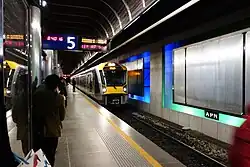 The station has five platforms and is constrained by the 9.3 m width of the 426 m long double-track access tunnel. Early forecasts predicted that while double-tracking of the surrounding rail network would improve peak time train congestion, the capacity of the corridor would not be reached until about 2020.[38] Growth in train patronage and increased services resulted in the tunnel being at maximum capacity from 2011, almost 10 years earlier than predicted.[39] Because of the capacity restrictions, a proposed Hamilton-Auckland commuter train service would have gone to The Strand Station some 1.5 km to the east.[40]