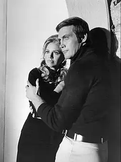 In the same year Ekland was originally cast in the dramatic role of Karen Eriksson in the British film Guns at Batasi starring Richard Attenborough, Jack Hawkins, Flora Robson, and sixties heartthrob actor/singer John Leyton. However she left the Pinewood production after only three weeks into filming due to tension with her new husband Peter Sellers,[5] who was apparently so paranoid about Ekland having an affair with Leyton he secretly asked his old acting friends, David Lodge and Graham Stark who were co-starring in the picture, to keep an eye on her.[6] After being quizzed nightly on the telephone by Sellers about her scenes and who she was with, Ekland left the shoot to join Sellers in Los Angeles.[6] Ekland has said that Sellers insisted that she leave the set, come to America, then claim that an illness prevented her from returning.[7] Her role was quickly recast and completed by Mia Farrow.[8][9] In response 20th Century Fox sued Ekland for $1.5 million; Sellers counter-sued for $4 million claiming the Fox suit caused him "mental distress and injury to his health".[10]
