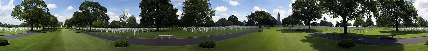 The Brittany American Cemetery, 28 acres (11 ha) in extent, lies among the hedgerows in rolling farm country in Normandy near the border with Brittany in France. It is one of fourteen permanent American World War II military cemetery memorials erected by the American Battle Monuments Commission on foreign soil.