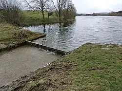 The pond is fed by an offtake from the River Camac at the southern pond's south-eastern corner, which was historically operated by a sluice gate to regulate the water level; a short canal carried water from the southern to the northern pond. The Camac maintained its course just east of the pond and was rejoined by an outlet flow from the pond area (again controlled by a sluice) a short distance downstream of the northern pond. Although no longer operable, the remains of some of these sluice gates are still in existence.[6] As of 1993, the ponds had a depth of around 20 feet.[5]