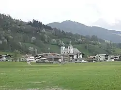 The main settlement is Hopfgarten im Brixental (623 m), where the valley changes direction by 70°. Other large villages are not found until the upper reaches because, there, the valley floor is wider (see picture): Brixen im Thale (794 m), where several headstreams unite, and especially Kirchberg in Tirol (837 m), where the Spertental joins the Brixental not far from Kitzbühel.