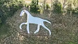 The horse serves as an icon for the village, and Leighton has described the horse as having served "for more than a century as a dazzling emblem or logo for the village below."[7] The horse appears in the logo for the village's primary school,[2] and was stitched into an altar cloth for the school.[13] In 2015, wildlife artist Joanna May donated her painting of a hare besides the white horse to a Devizes charity auction; she said "Wiltshire is loved for being the area of the White Horse and also for the hare being synonymous with it."[14] The white horse is part of several tours, including the 90-mile walking tour 'Wiltshire's White Horse Trail',[15] better known as simply the White Horse Trail,[16] which visits all eight of the canonical white horses in Wiltshire.[15][16] The tour was established in 2000 by the Wiltshire Tourism board.[17]
