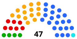 Since the last full review of boundaries in 2004 the council has comprised 47 councillors representing 27 wards, with each ward electing one, two or three councillors. Elections are held every four years.[22]