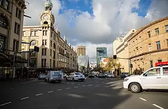Broadway is historically important because it is one of the first roads built in the colony of New South Wales, in 1794. It had been called "George Street South" and then "George Street West". After being widened in 1906 when the Central railway station was built, George Street west of Railway Square, it became colloquially known as "The Broadway".[1] Another widening scheme was devised in 1925, which sought to acquire buildings on the south side of the road.[2] Buildings were gradually acquired and demolished over the next decade, at a cost of over 400,000 pounds.[3][4] In 1933, the name "Broadway" was formally adopted for the road.[5] The last resumption was settled with St Benedict's Church in 1939, and the building was subsequently remodelled.[6][7]