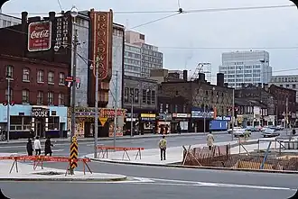 ![]() The Broadway Theatre on the south side of Queen Street West during the early 1960s; the vacant lot under construction across Queen would by 1965 become Nathan Phillips Square. | |
