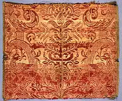Brocatelle is a silk-rich fabric with heavy brocade designs. The material is characterized by satin effects standing out in relief in the warp against a flat ground. It is produced with jacquard weave by using silk, rayon, cotton, or many synthetic yarns.[1][2]