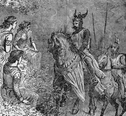 Wace numbers the Bretons from Brocéliande (Brecheliant), about whom there are many legends ("ceux de Brecheliant dont les Bretons disent maintes légendes..."), along with the Breton knights.[6] Wace gives the name of the fountain of Barenton ("La fontaine de Berenton/sort d'une part lez le perron...") and describes how hunters scoop water from it and wet a stone in order to summon rain; he also mentions rumors of fairies and magic. Wace travelled to Brittany in search of these wonders, but found nothing notable[1] and left disappointed: "I saw the forest and the land and looked for marvels, but found none. I came back as a fool and went as a fool. I went as a fool and came back as a fool. I sought foolishness and considered myself a fool."[7]