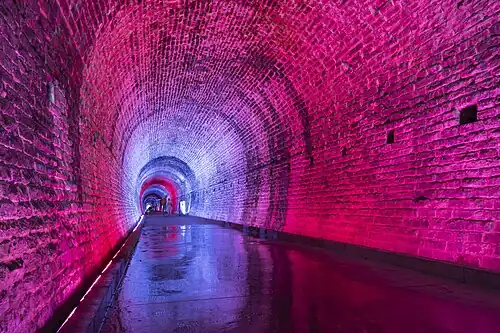 The Brockville Railway Tunnel, also called the Brockville Tunnel, is a former railway tunnel located beneath the downtown of Brockville, Ontario, Canada. It is the first railway tunnel built in Canada; construction began in September 1854 and the first train passed through the tunnel on December 31, 1860. Since 2017 it has been opened to the public as a free seasonal tourist attraction.
