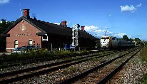 The Brockville railway station in Brockville, Ontario, Canada is served by Via Rail trains running from Toronto to Ottawa and Montreal. It is a staffed railway station, with ticket sales, outdoor parking, telephones, washrooms, and wheelchair access to the platform and trains.[1]