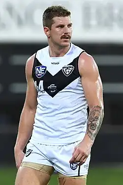 Brodie Murdoch (born 21 January 1994) is a former professional Australian rules footballer who played for the St Kilda Football Club in the Australian Football League (AFL). He was recruited by the club in the 2012 National Draft from SANFL club Glenelg, with pick 40. His original country club is Port MacDonnell in the Southeast of SA. Murdoch made his debut in Round 5, 2013, against Sydney at Westpac Stadium in Wellington NZ.[1] At the conclusion of the 2016 season, he was delisted by St Kilda. He went on to win consecutive premierships with Port Melbourne in the VFL (2017) and Southport in the NEAFL (2018).[2]