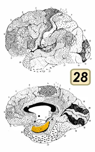 Brodmann area 28 is a subdivision of the cerebral cortex defined on the basis of cytoarchitecture. It is located on the medial aspect of the temporal lobe and is part of the entorhinal cortex[1]