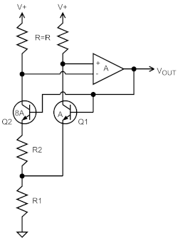 In the example circuit shown, the opamp ensures that its inverting and non-inverting inputs are at the same voltage. This means that the currents in each collector resistor are identical, so the collector currents of Q1 and Q2 are also identical. If Q2 has an emitter area that is times larger than Q1, its base-emitter voltage will be lower than that of Q1 by a magnitude of . This voltage is generated across and so defines the current in each leg as . The output voltage (at the opamp output) is therefore , or:
