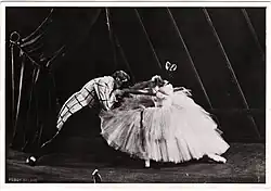 Here initially Nijinska danced in the corps de ballet, e.g., in Swan Lake (the Czardas), in Les Sylphides (the Mazurka), and in Le Spectre de la Rose. As she developed on the professional stage she was promoted, and eventually given significant parts. Her brother coached her for the role of Papillon [the butterfly] in Fokine's Carnaval (1909). In part danced with feet and hands fluttering in a coordinated rhythm at an accelerated prestissimo tempo, she eluded Pierrot, played in pantomime by Vsevolod Meyerhold.[56] The role of the Ballerina Doll in Petruchka (1912) was also transformed. By changing the doll's demeanor from theatrical in a tutu to realistic in street clothes, Nijinska modernized the role. She also continually kept in character rather than slipping back into the default look of classical ballet. Among others, the pseudo-Hindu dance of the Bayadere Enivree in Le Dieu bleu she did, but did not care for. She struggled and grew as an Odalisque in the popular ballet Scheherazade.[57][58][59]