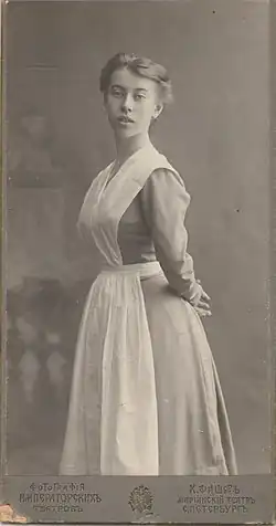 Bronislava graduated in 1908, taking 'First Award' for achievement both in dance and in academic subjects. Seven women graduated that year. In addition to her diploma she was enlisted as an 'Artist of the Imperial Theatre'. It was a government formality which assured her of financial security, and of the privileged life of a professional dancer.[30][31]