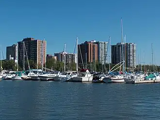 In April 2009, the Bronte Business Improvement Association and the owners of the Bronte Village Mall presented a proposal for revitalizing the mall which includes residential, office and retail space.[4] The zoning was approved in 2012 following the resolution of a zoning dispute between the developer and the Town of Oakville at the Ontario Municipal Board.[5] The mall was then redeveloped into 10- and 14-storey residential buildings with ground floor retail and a combined total of 480 luxury rental units, as well as a Rexall outlet.[6]