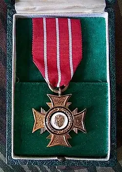 The medal was a bronze cross with an enamelled roundel in the centre bearing a lion's head, suspended from a ribbon. The ribbons of the Bronze Cross differed in colour according to the service in which the recipient was enlisted; thus Army awards had a red ribbon with three white stripes