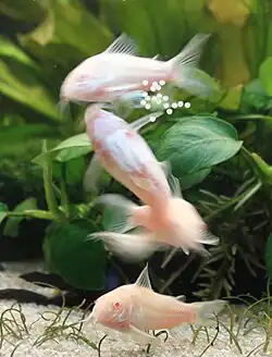 The albino corydoras is an albino variety of the bronze corydoras that has been developed for the aquarium trade, with a pale pink or orange body and red eyes. It is physically similar to normally-colored individuals, although some breeders report that the fry are a little slower to develop.[10] Others say that the albinos are practically blind and that the males are somewhat sterile, although this may be due to extensive inbreeding.[10] Albino bronze corydoras are frequently injected with bright dye (via a needle) and sold in aquariums. This controversial practice is known as "painting" or "juicing" fish.