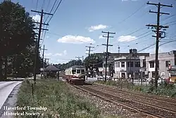 Properties on Brookline Boulevard were originally intended for houses. By the 1920s, the corner of Darby Road and Brookline Boulevard began to see new businesses.[6] Brookline Boulevard, at its meeting with Darby Road, developed as a business district due to the presence of the trolley stop. The business district included a retail, grocery, and a movie theater.[12] Though the Ardmore Trolley line closed in 1966, its influence on the built form of Haverford Township and Brookline continues with its street-fronting commercial areas around former trolley stations.[13][14]