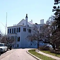 The property went unused for several years because Adams's successor Thomas Jefferson opposed military build-up.[14] The Brooklyn Navy Yard became an active shipyard for the United States Navy in 1806, when the yard's first commandant Jonathan Thorn moved onto the premises.[13][20][21] It took several decades before the Brooklyn Navy Yard was fully developed; for the most part, early development was focused around the western side of the current yard.[22] It was around the same time that Quarters A, the federal-style commandant's house, was built at the northwestern corner of the Brooklyn Navy Yard.[23][24] In 1810, the federal government acquired another 131 acres (53 ha) of land from the state of New York.[17][25] Much of this land was underwater at high tide.[25] During the War of 1812, the Brooklyn Navy Yard repaired and retrofitted more than 100 ships, although it was not yet used for shipbuilding.[25][26][27]