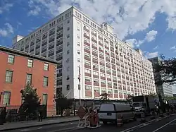 The Navy constructed at least 18 buildings at the Brooklyn Navy Yard during World War II, using any available land. These structures included a materials testing laboratory, a foundry, two sub-assembly shops, an ordnance machine shop, and a building trades shop.[110] The sub-assembly structures were constructed at the end of each dry dock; they each measured 800 by 100 feet (244 by 30 m) in perimeter and 105 feet (32 m) tall.[117] They fabricated sections of the ships before the completed pieces were joined to the hull, which, along with the introduction of welding, allowed for increased efficiency in the shipbuilding process.[132][133] Another large structure constructed at the Navy Yard was Building 77, a sixteen-story building that served as the yard headquarters, as well as storage space.[132] In addition, a housing development was built exclusively for Navy Yard workers in Fort Greene, a neighborhood located immediately south of the Navy Yard. The development, the Fort Greene Houses, was completed in 1942.[134][135] A motion picture exchange for armed forces was constructed at the eastern end of the Brooklyn Navy Yard, near the naval hospital, and served to restore, review, and distribute films for use by U.S. Navy troops around the world.[132]