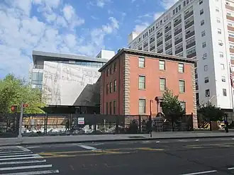By the 1820s, the Navy Yard consisted of the commandant's house, a marine barracks building, several smaller buildings, and shiphouses on what is now the northwestern corner of the yard. Of these, the commandant's house is the only remaining structure.[31] The Navy acquired an additional 25 or 33 acres (10 or 13 ha) from Sarah Schenck in 1824, on which it built the Brooklyn Naval Hospital.[32][31][33] The same year, it was converted into a "first-class" yard.[34][31] The hospital opened in 1838.[35] During the Great Fire of New York on December 16, 1835, the Navy Yard sent a detachment of U.S. Marines and sailors to help fight the fire, which had quickly consumed much of which is now the Financial District. The detachment detonated buildings in the fire's path, which created fire breaks and reduced the fire's ability to spread, leading The Long Island Star to report that the "detachment of marines from the navy yard under Lieutenant Reynolds and sailors under Captain Mix rendered the most valuable service..."[36] Similarly. during the Great Fire in Lower Manhattan on July 19, 1845, "a detachment of sailors and marines from the navy yard under Captain Hudson, were present, and did good service. The USS North Carolina which was acting as a receiving ship for new enlisted men, also sent her sailors in boats for shore duty."[37] The Navy Yard also sent materials for blowing up buildings and creating firebreaks.[38]