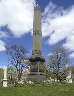 The Brooklyn Theatre fire was a catastrophic theatre fire that broke out on the evening of December 5, 1876, in the city of Brooklyn (now a borough of New York City). The fire took place at the Brooklyn Theatre, near the corner of Washington and Johnson streets, with over 1,000 guests attending. The conflagration killed at least 278 individuals, with some accounts reporting more than 300 dead. 103 unidentified victims were interred in a common grave at Green-Wood Cemetery, marked by an obelisk, while more than two dozen identified victims were interred individually in separate sections at the Cemetery of the Evergreens in Brooklyn.
