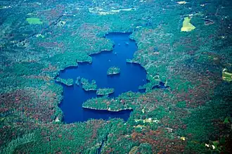 Brooks Pond is a mostly shallow pond dammed up roughly to its present size in 1848. The actual impoundment/size was again altered slightly after the Hurricane of 1938 washed out the existing bridge and resulted in a slight relocation of the spillway outlet/entry into the Five Mile River. Brooks Pond has been demonstrated via two separate recent studies, including one conducted by an expert firm, to originally have been well under 10 acres (40,000 m2) in size in its naturally occurring state, thus disqualifying it as a Massachusetts Great Pond. This has been affirmed in a Massachusetts Court Case (Ref: Worcester Superior Court, Civil Action No. 04-0341, dated December 31, 2009. Judgment on Finding issued January 6, 2010). As noted above, it has been considerably enhanced in size by an earthen dam and cast spillway, and some parts range to 26 feet (8 m) in depth. The water is generally clean but exhibits slight coloration from leaf tannin and gets quite warm in the summertime. Brooks Pond is near a watershed boundary where waters to its north and west are part of the Ware River watershed and waters to its south and east are part of the Quaboag River watershed. Situated in a heavily forested area, the character of the pond in decades past—of mainly just summerhomes—has yielded to increasing numbers of permanent, full-time residences along its lengthy shoreline.