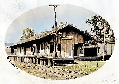 Led by John Hale, four forward-thinking business leaders (John Parsons, Christopher Keathly, John Hale, and W.S. Hancock) in the tiny town of Brooksville were eager to bring the railroad to their area. They formed the Brooksville Railroad Association and The Brooksville Telegraph Company and paid $20,000 to The Florida Southern Railroad to lay track twelve miles from the main line at Pemberton Ferry (Croom) to Brooksville.[5] Bonds were sold and the Train Depot was built in 1885.[6] The building still stands today. W.S. Hancock and Frank Saxon became officers of the telegraph company.