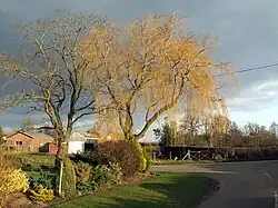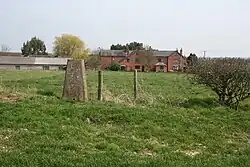 Several buildings within the parish are listed at grade II, the lowest of the three grades.[17] The oldest listed building is Top of the Town, off Heatley Lane, a farmhouse dating originally from the early 17th century. It has projecting end bays and a tiled roof, and is part roughcast over brick and part timber framed, featuring some close studding with a middle rail.[18] Two farmhouses on Heatley Lane are listed: Heatley is an L-shaped, red-brick building with a slate roof, dating from around 1750, and The Coronerage is a roughcast brick building with a tiled roof, dating originally from the early 19th century. Each has a front porch with decorative barge boards, topped with a finial.[19][20] Mickley Bridge is a blue-brick-and-stone accommodation bridge over the Shropshire Union Canal, dating from around 1826,[21] and a nearby cast-iron canal milepost is also listed.[22] Additionally, the remains of a moat are visible south east of Mickley Hall.[2][3][23]