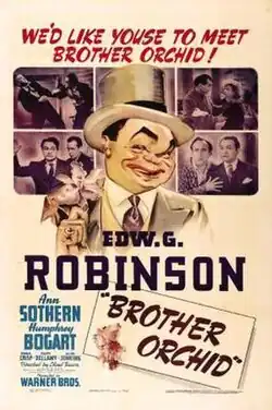 Brother Orchid is a 1940 American crime/comedy film directed by Lloyd Bacon and starring Edward G. Robinson, Ann Sothern and Humphrey Bogart, with featured performances by Donald Crisp, Ralph Bellamy and Allen Jenkins. The screenplay was written by Earl Baldwin, with uncredited contributions from Jerry Wald and Richard Macauley, based on a story by Richard Connell originally published in Collier's Magazine on May 21, 1938.[1] Prior to the creation of the movie version of Connell's story, a stage adaptation was written by playwright/novelist Leo Brady. The script was originally produced at Catholic University of America in Washington, D.C.