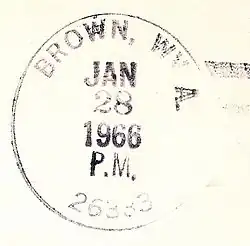 It was in 1790 that the first white settlers took up permanent residence on Little Tenmile Creek at what would become the community of Brown. These were James Kelly (1760–1810) and his wife Elizabeth (Swiger) Kelly (1764–1824). Initially, the settlement was known as "Brown's Mills", but a post office shortening the name to "Brown" was established in 1894, and remained in operation until 1966.[2] The community derives its name from John Brown, an early settler and the proprietor of local grist mills.[3]