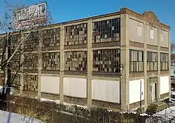 Wayne Avenue façade with relief of "The Brown Instrument Company" in stone.