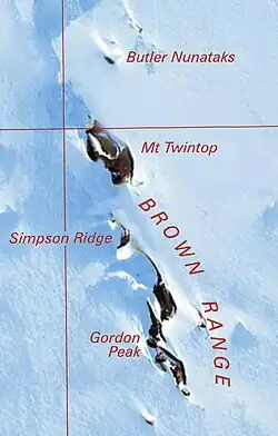 This article incorporates public domain material from websites or documents of the United States Board on Geographic Names. - "Brown Range", Gazeteer, Australian Antarctic Data Centre, retrieved 2023-11-29
