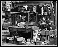 The area was fairly economically successful in its heyday. In 1942, there were 372 stores, including 8 banks and 43 stores selling menswear, along a 3-mile (4.8 km) stretch of Pitkin Avenue, which employed a combined 1,000 people and generated an estimated $90 million annually (equal to about $1,732,000,000 today if adjusted for inflation).[12]: 31 [19] The median income of $2,493 in 1933 (about $60,556 today) was twice that of a family living on the Lower East Side, who earned a median of $1,390 (about $33,764 today) but lower than that of a middle-class family in outer Brooklyn ($4,320, inflation-adjusted to $104,935) or the Bronx ($3,750, inflation-adjusted to $91,089).[12]: 32 [19] The Fortunoff's furniture chain had its roots on Livonia Avenue, its flagship store overshadowed by the tracks of New York City Subway's New Lots Line from 1922 to 1964, eventually expanding elsewhere in the New York metropolitan area.[8][20] At one point in the 1943 published book, New York City Market Analysis, it had described Brownsville as having a variety of small industry unlike Lower East Side. The book also mentioned the Jewish populations were a mix of Russian, Austrian, and Polish immigrants and were 80% of the foreign born population in the neighborhood.[21]