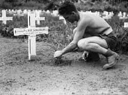 His actions demoralised the Japanese, killing several and forcing others to find cover.[13] The rest of the Australian group, inspired by Kingsbury's actions, forced the Japanese further back into the jungle.[13] Kingsbury was then shot and mortally wounded by a Japanese sniper. The sniper fired one shot before disappearing. Avery, who had been about 6 feet (1.8 m) from Kingsbury, briefly chased after the sniper but returned to carry Kingsbury to the regimental aid post;[13] Kingsbury was dead by the time he arrived there.[15]