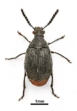 Bruchidius siliquastri is a species of bean weevil.[1] It was first found in pods of Cercis siliquastrum in China, and has thence been found in several continents.[2][3] Its length ranges from 2.8 to 3.7 millimetres (0.11 to 0.15 in). Its body is short and ovate, with a black integument. The apex of its femora and the ventral part of its hind tarsi are reddish. Its vestiture is made of thin and short setae; dorsally setae are a whitish colour, denser on the scutellum. Its pygidium is also covered with setae.[1] Its name is derived from its host plant.