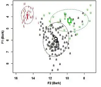Brunei Malay has a three-vowel system: /i/, /a/, /u/.[2][10] Acoustic variation in the realisation of these vowels is shown in the plot on the right, based on the reading of a short text by a single female speaker.[3]